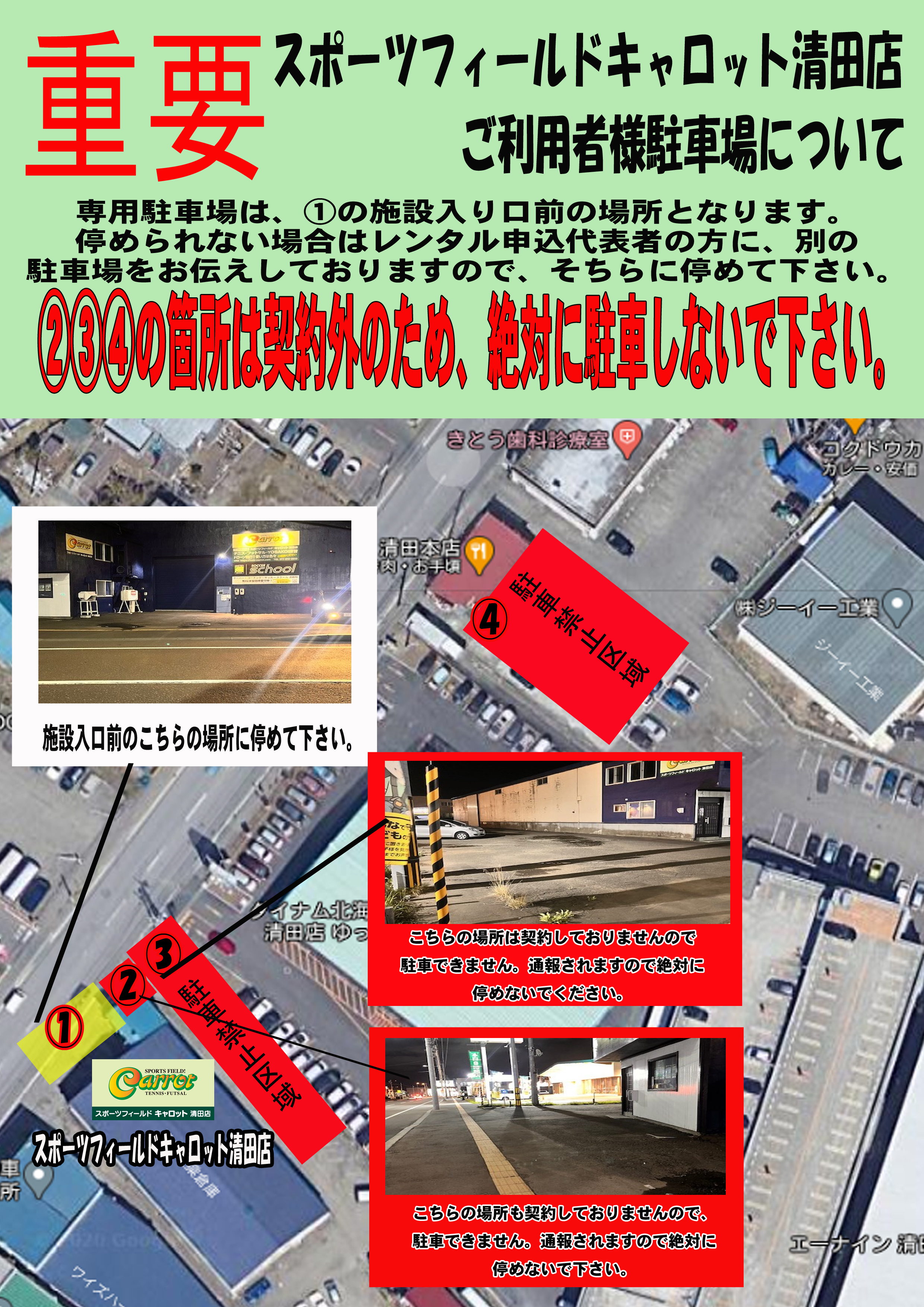 いつもスポーツフィールドキャロット清田店をご利用頂き 誠にありがとうございます。 さて以前からお伝えしておりましたが、 8/1より駐車場の場所が一部変更となります。 〇施設前には今まで通り停められますが、 歩道にはみ出て駐車…